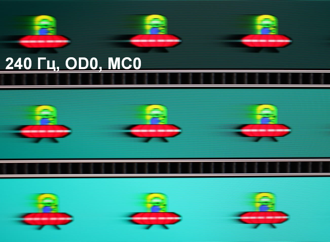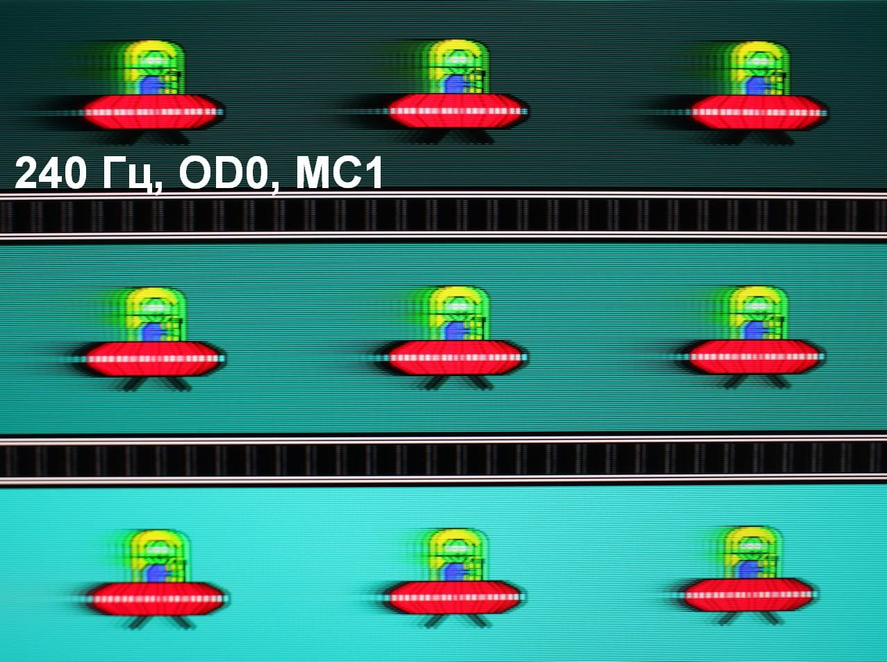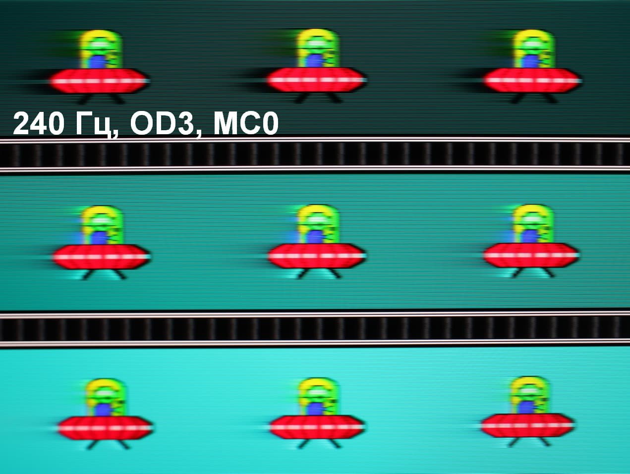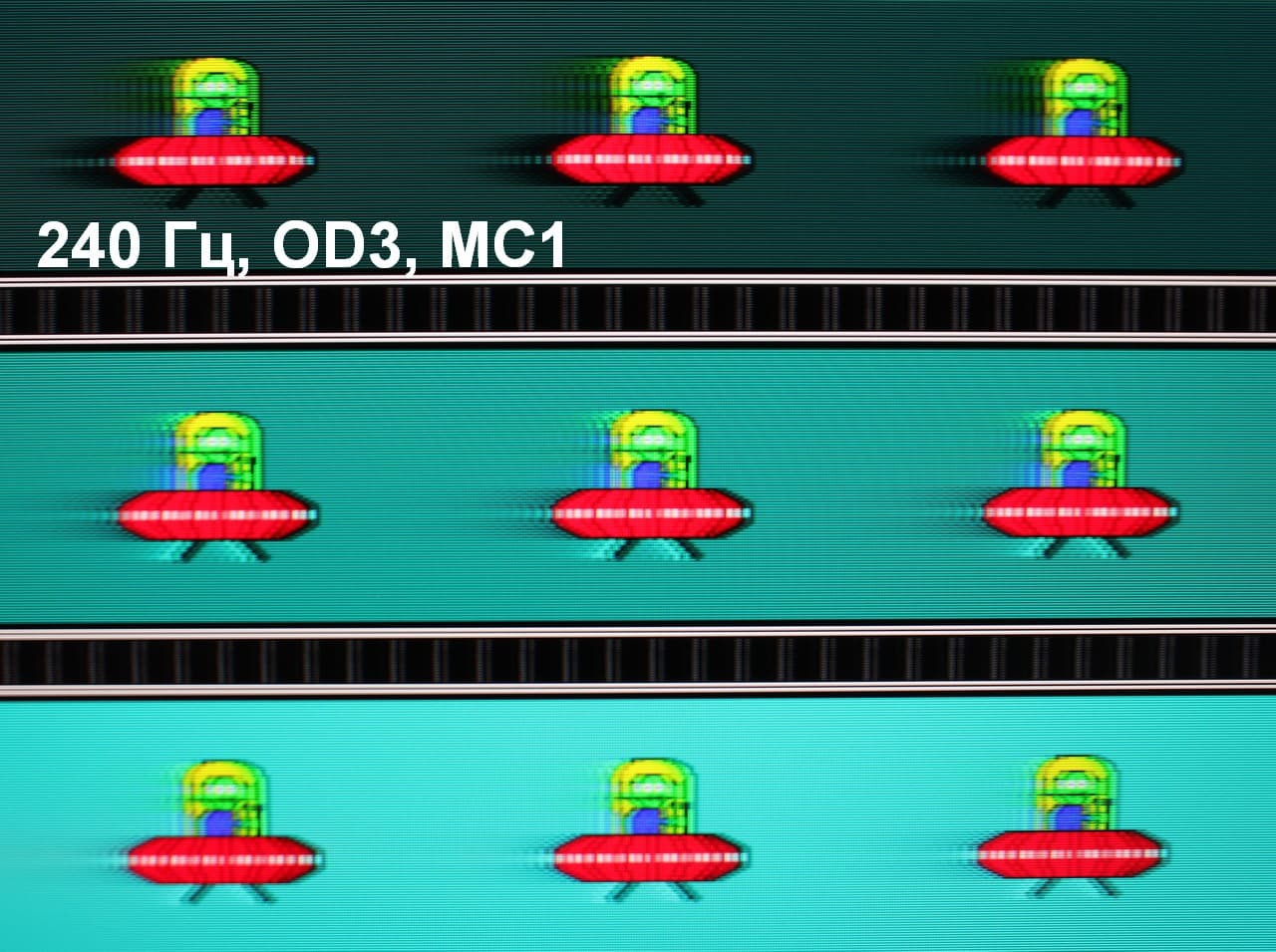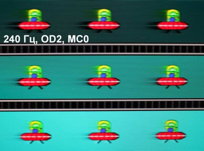 Для наглядного представления о том, что на практике означает такая скорость матрицы, какие могут быть артефакты от разгона и повышает ли четкость в движении, описанная выше настройка Motion Clearness, приведем серию снимков, полученных с помощью движущейся камеры. Такие снимки показывают, что видит человек, если он следит глазами за двигающимся на экране объектом. Описание теста приведено тут, страница с самим тестом тут. Использовались рекомендованные установки (скорость движения 960 пиксель/с для частот обновления 60, 120 и 240 Гц), выдержка 1/15 с, на фотографиях указаны значения частоты обновления, а также ступень разгона (ODx) и ступень режима Motion Clearness (MCx).