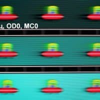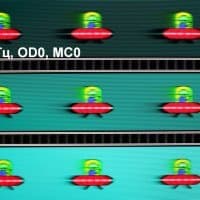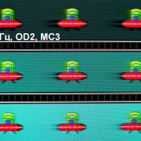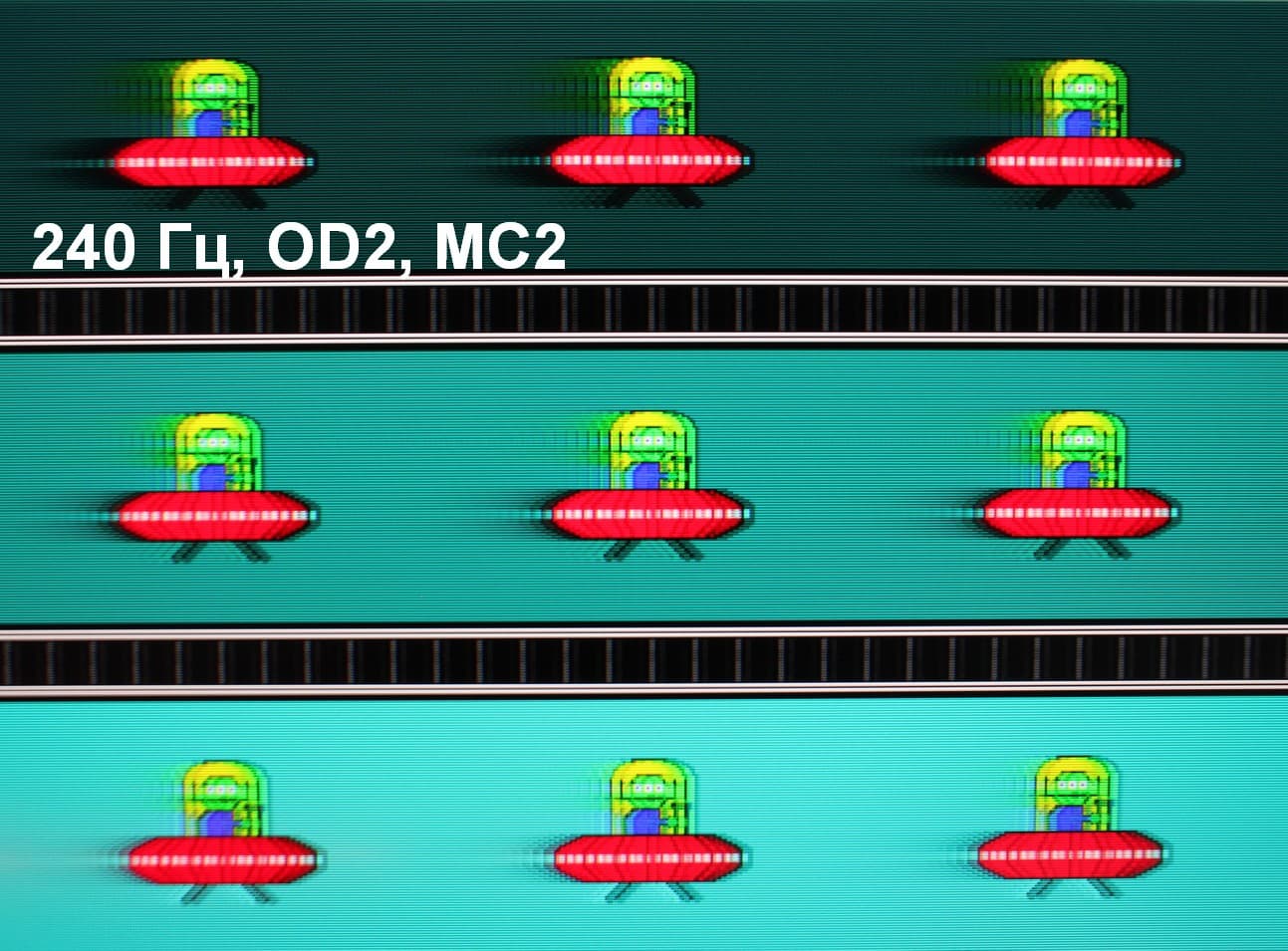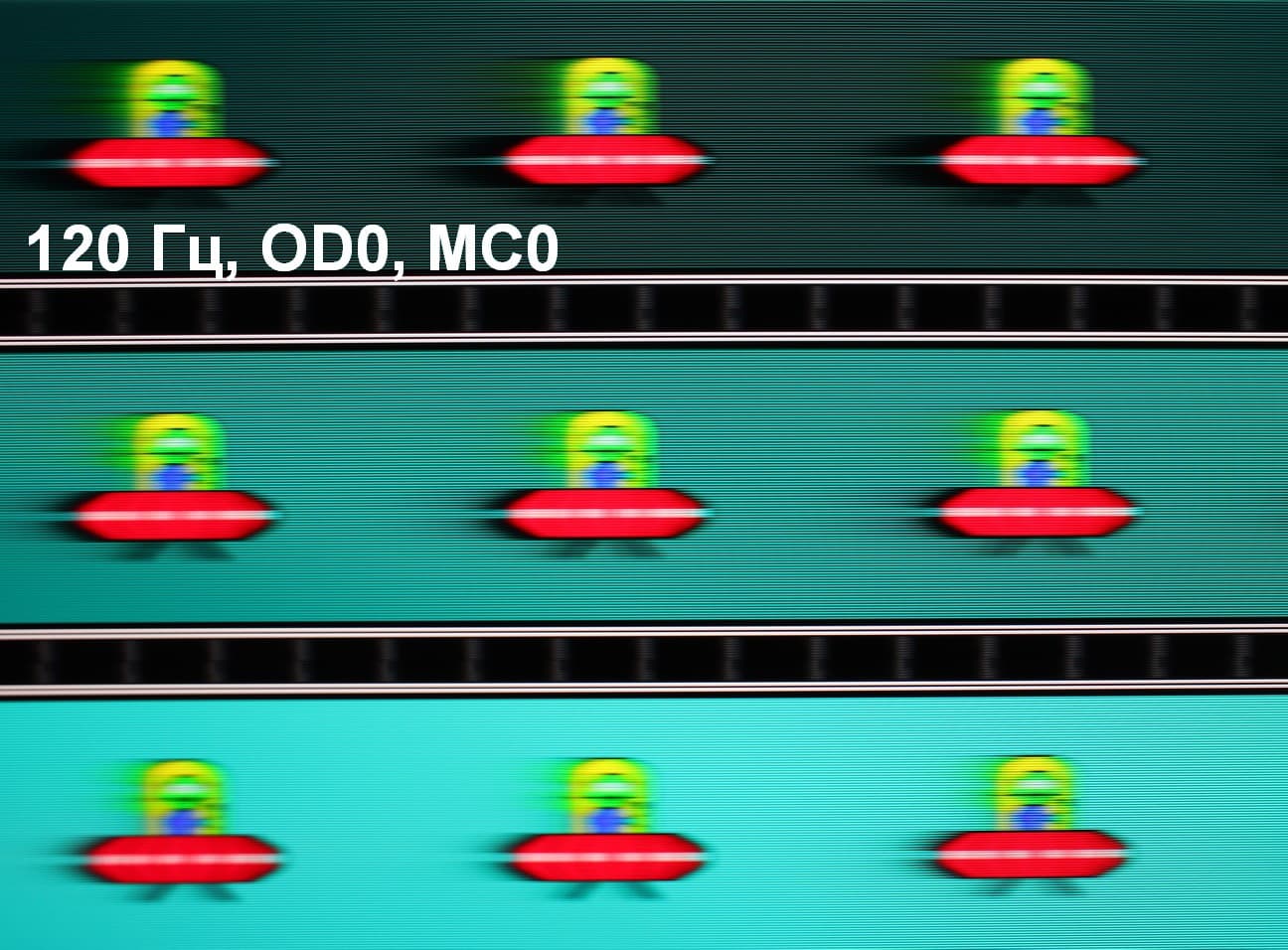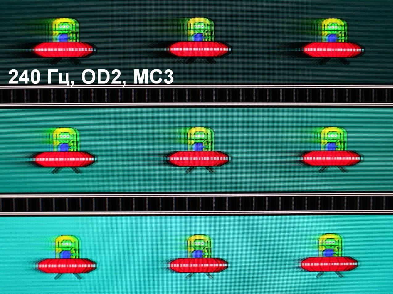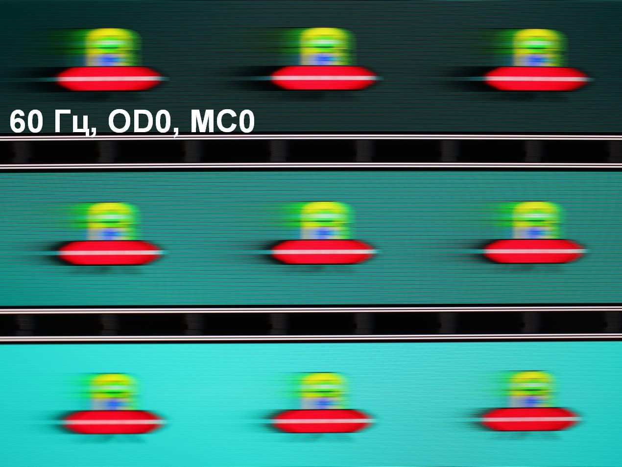 Для наглядного представления о том, что на практике означает такая скорость матрицы, какие могут быть артефакты от разгона и повышает ли четкость в движении, описанная выше настройка Motion Clearness, приведем серию снимков, полученных с помощью движущейся камеры. Такие снимки показывают, что видит человек, если он следит глазами за двигающимся на экране объектом. Описание теста приведено тут, страница с самим тестом тут. Использовались рекомендованные установки (скорость движения 960 пиксель/с для частот обновления 60, 120 и 240 Гц), выдержка 1/15 с, на фотографиях указаны значения частоты обновления, а также ступень разгона (ODx) и ступень режима Motion Clearness (MCx).