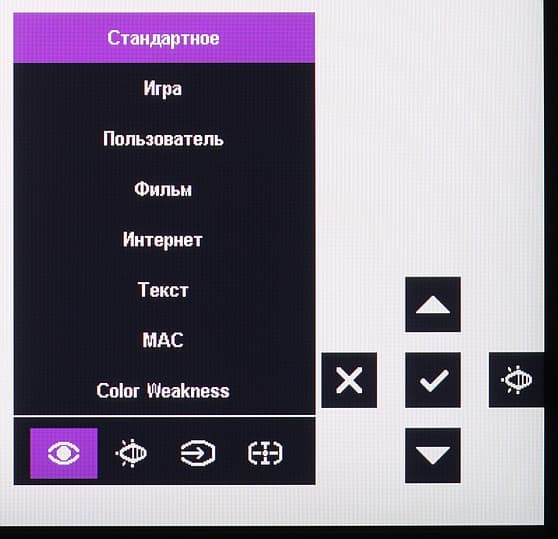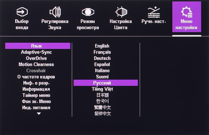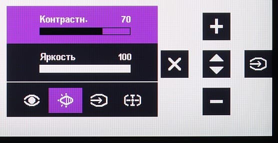 При навигации по меню справа выводятся подсказки по текущим функциям джойстика. Навигация удобная, так как все делается только джойстиком, не нужно переносить палец на кнопки, к тому же списки зациклены. При настройке изображения меню остается на экране — это несколько мешает оценке вносимых изменений. Можно включить легкую прозрачность фона меню и выбрать задержку автоматического выхода из меню. Присутствует русская версия экранного меню.