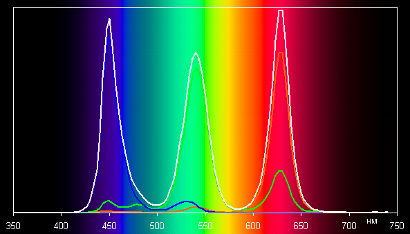 Ниже приведен спектр для белого поля (белая линия), наложенный на спектры красного, зеленого и синего полей (линии соответствующих цветов), когда в явном виде нет корректировки цветового охвата