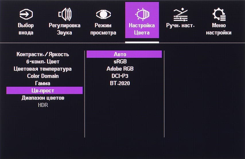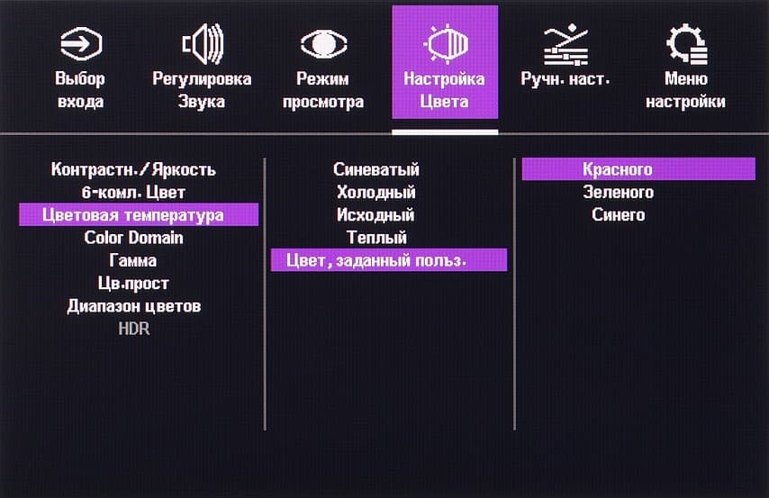 К сожалению, после выбора профиля sRGB (и всех других, отличных от варианта Авто), часть настроек, в частности настройки цветового баланса, становятся не доступными. Это типичная ошибка многих производителей мониторов. Отметим, что на экранах с широким цветовым охватом без соответствующей коррекции цвета обычных изображений, оптимизированных для устройств sRGB, выглядят неестественно насыщенными. Впрочем, как правило, в развитых OS, в Windows в частности, и/или в более-менее продвинутом ПО для работы с изображениями нужная коррекция цвета достигается при использовании системы управления цветом. Например можно использовать цветовой профиль, созданный нами во время тестирования с помощью ПО DisplayCAL. Однако в большинстве случаев достаточно будет выбрать профиль sRGB в мониторе.