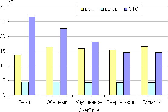 Время отклика зависит от значения настройки OverDrive, которая управляет разгоном матрицы. Ступеней регулировки четыре плюс вариант Dynamic с автоматическим выбором разгона в зависимости от частоты кадров. График ниже показывает, как меняется время включения и выключения при переходе черный-белый-черный (столбики «вкл.» и «выкл.»), а также среднее суммарное время для переходов между полутонами (столбики GTG) в случае режима с частотой обновления 240 Гц: