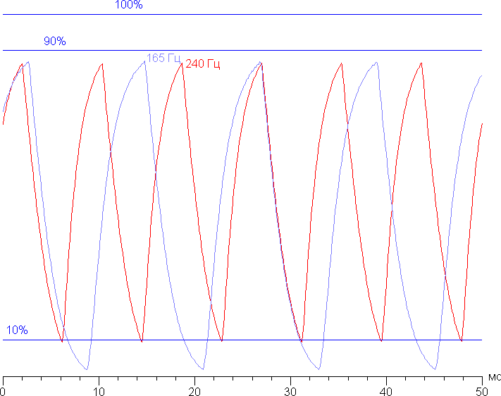 Видно, что при 240 Гц максимальная яркость белого кадра ниже уровня 90% от белого, а минимальная яркость черного кадра лишь немного ниже 10% от белого. Амплитуда изменения яркости ниже 80% от уровня белого. То есть согласно этому формальному критерию скорости матрицы недостаточно для вывода изображения с кадровой частотой 240 Гц. В случае 165 Гц уже достаточно, так как амплитуда изменения яркости выше 80%.