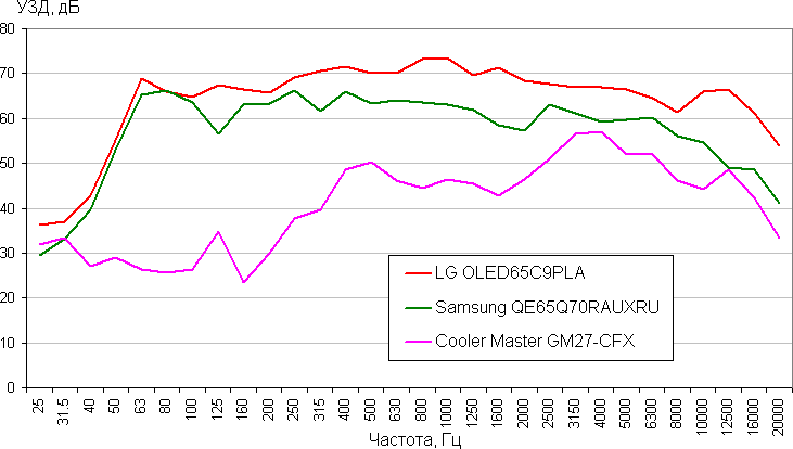 Встроенные громкоговорители звучат согласно их размерам и акустическому окружению — настолько громко, чтобы сидящий перед монитором пользователь расслышал системные сигналы, без низких частот вообще, с выраженным «пластиковым» призвуком из-за резонансов корпуса, с очень большими искажениями громких звуков, но хоть стереофонический эффект присутствует. Сравним АЧХ этого монитора с АЧХ двух телевизоров высшего класса (воспроизводился розовый шум, уровни звукового давления в 1/3 октавах записывал шумомер Октава-111):
