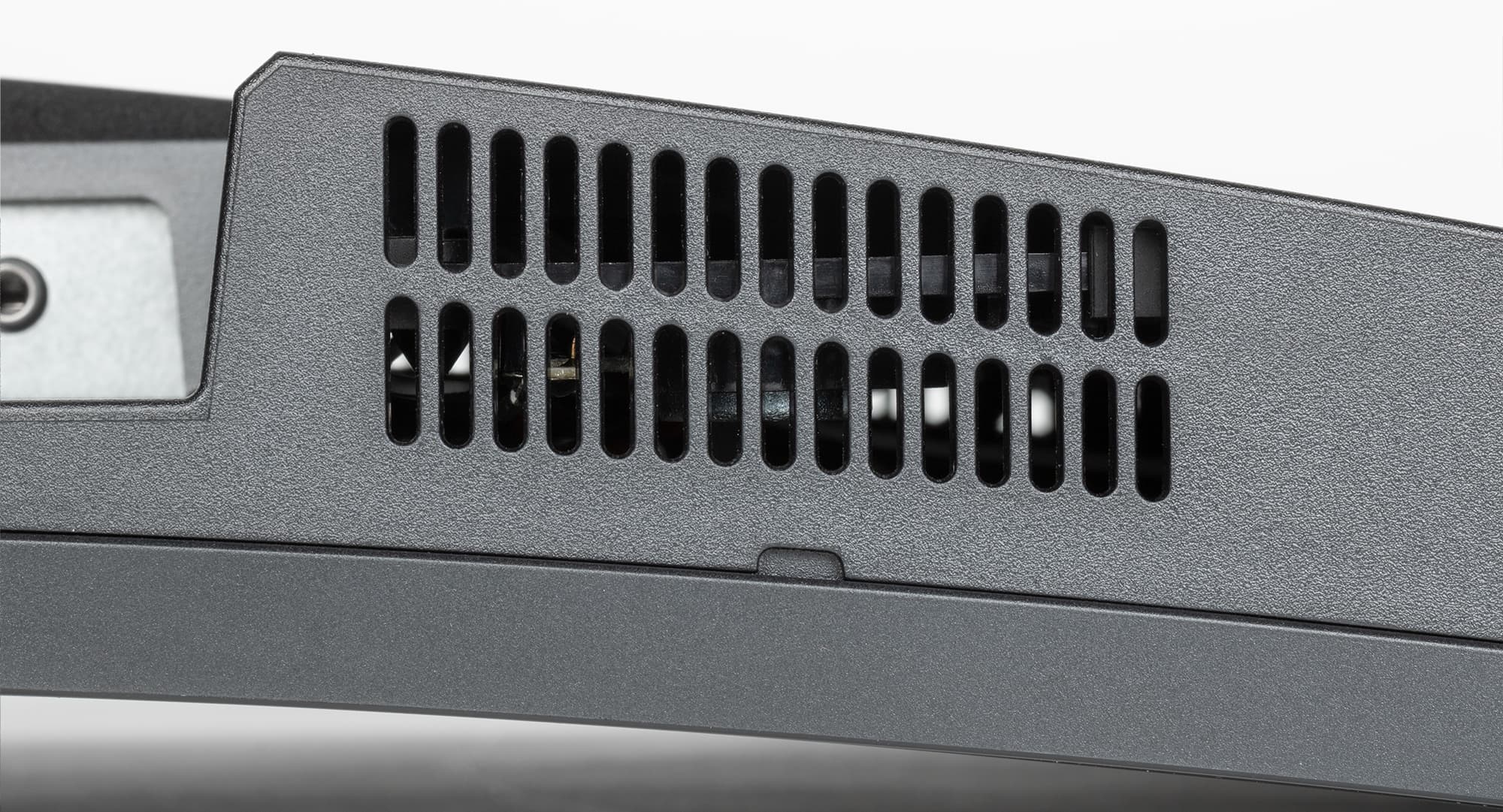 На нижнем торце и в верхней части на задней панели есть вентиляционные решетки. За решетками на нижнем торце размещены два бокса с крохотными громкоговорителями.