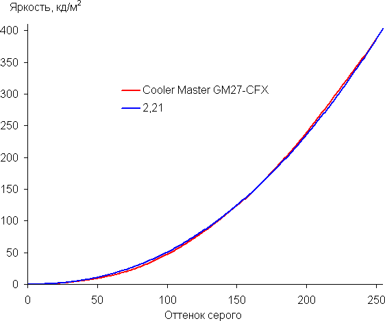 Аппроксимация полученной гамма-кривой дала показатель 2,21, что очень близко к стандартному значению 2,2, при этом реальная гамма-кривая немного отклоняется от аппроксимирующей степенной функции: