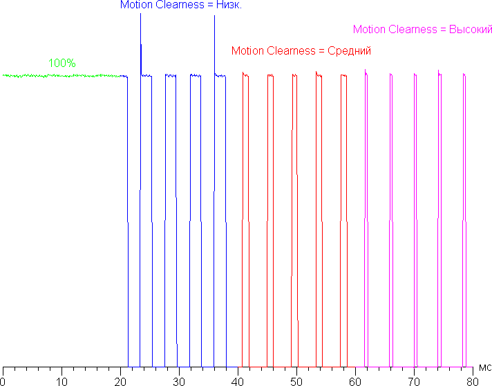 Есть режим со вставкой черного кадра с названием Motion Clearness. Зависимости яркости (вертикальная ось) от времени (горизонтальная ось) когда эта функция выключена (Яркость = 100%) и для трех значений параметра Motion Clearness:
