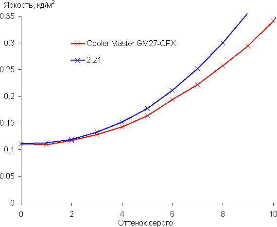 Рост прироста яркости на большей части шкалы серого более-менее равномерный, и почти каждый следующий оттенок ярче предыдущего, только в тенях ближайший к черному оттенок серого аппаратно и визуально не отличается по яркости от черного: