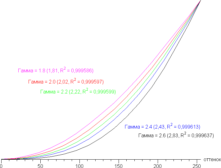 Реальная гамма-кривая зависит от выбранного профиля в списке Гамма (значения показателей аппроксимирующей функции приведены в скобках в подписях, там же — коэффициент детерминации):