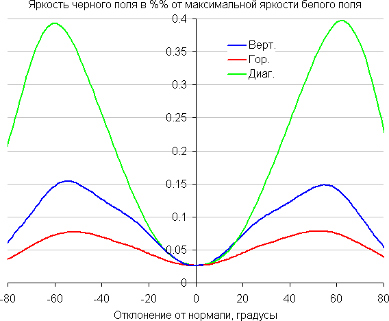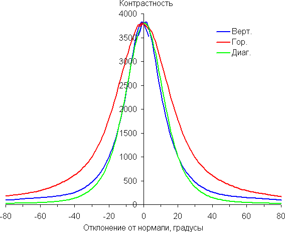 По скорости падения яркости углы обзора не очень широкие. Отметим примерно одинаковый характер уменьшения яркости при отклонении от перпендикуляра к экрану во всех трех направлениях, при этом графики не пересекаются в значимом диапазоне измеряемых углов. При отклонении в диагональном направлении яркость черного поля достигает большего значения, чем в двух других случаях. Однако относительный максимум яркости черного поля все равно меньше, чем в случае типичного монитора на матрице IPS. Контрастность в диапазоне углов ±82° приближается к отметке 10:1 только при отклонении по диагонали, но все равно остается существенно выше этого значения.