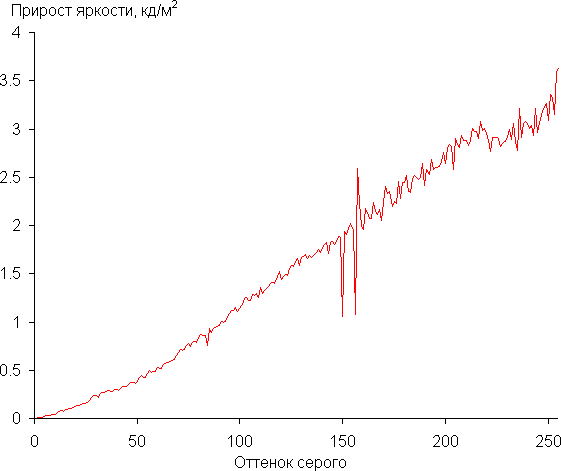 Реальная гамма-кривая ближе всего к стандартной при выборе варианта Гамма 2.2, поэтому далее мы измерили яркость 256 оттенков серого (от 0, 0, 0 до 255, 255, 255) при этом значении. График ниже показывает прирост (не абсолютное значение!) яркости между соседними полутонами: