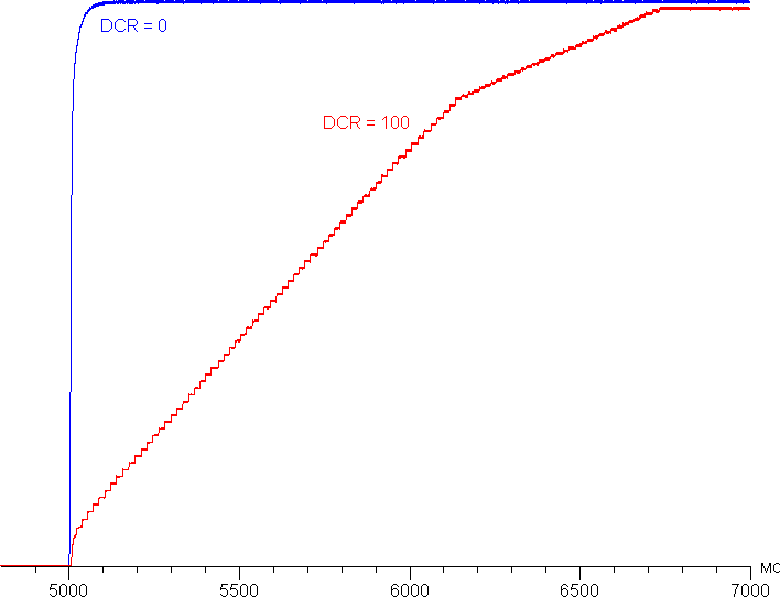 При включении режима с динамическим управлением яркости установившаяся контрастность формально возрастает, но не до бесконечности, так как даже на черном поле во весь экран подсветка совсем не выключается. График ниже показывает, как увеличивается яркость (вертикальная ось) при переключении с черного поля (после пяти секунд вывода) на белое при выключенной и включенной динамической подстройке яркости:
