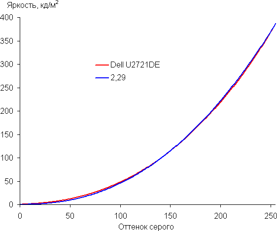 Рост прироста яркости более-менее равномерный, и каждый следующий оттенок значимо ярче предыдущего, даже в самой темной области. При этом в темной области наблюдается почти линейный рост яркости, что близко к требованием стандарта sRGB: