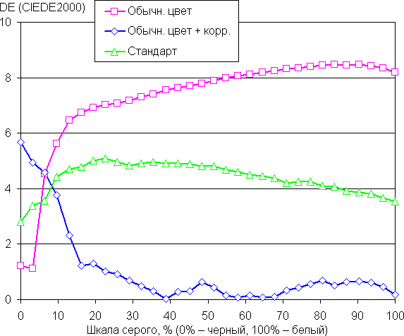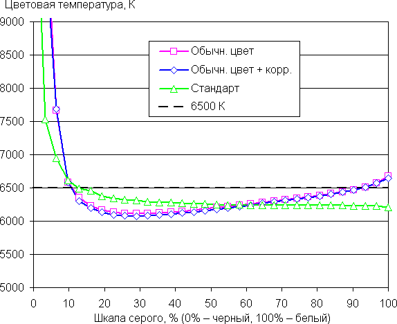 Цветовой баланс просто при выборе предустановленного профиля Обычн.цвет немного отличается от стандартного (но при этом достигаются максимальные значения яркости и контрастности), поэтому мы попытались вручную скорректировать цвета, регулируя усиление трех основных цветов. Графики ниже показывают цветовую температуру на различных участках шкалы серого и отклонение от спектра абсолютно черного тела (параметр ΔE) в случае исходного профиля Обычн.цвет и после ручной коррекции (100/95/99 для R/G/B). Также приведены результаты в случае профиля Стандарт, в котором, к сожалению, настройки цветового баланса недоступны: