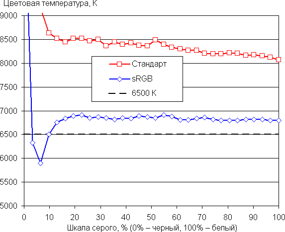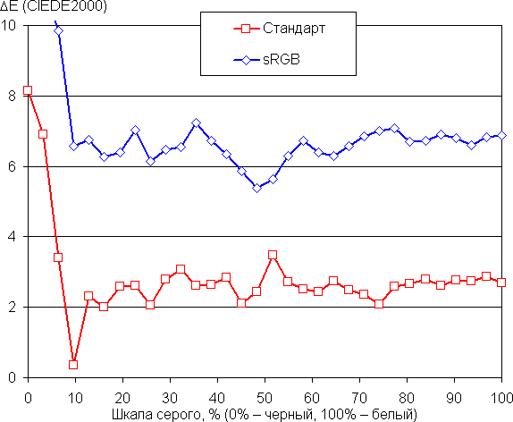 Цветовой баланс просто при выборе варианта Пользователь (профиль Стандарт) для настройки Режим цвета, который обеспечивает максимальную яркость и контрастность с сохранением приемлемого качества изображения, средний, так как цветовая температура существенно выше стандартных 6500 К, но отклонение от спектра абсолютно черного тела (параметр ΔE) ниже 10 единиц, что для потребительского устройства считается приемлемым показателем. Впрочем, при этом оба параметра мало изменяются на различных участках шкалы серого, что улучшает визуальное восприятие цветового баланса. В случае профиля sRGB цветовая температура достаточно близка к стандартным 6500 К и ΔE ниже 10 единиц, поэтому этот профиль можно использовать при просмотре обычных изображений, не прибегая к CMS. Графики ниже показывают цветовую температуру на различных участках шкалы серого и ΔE в случае профилей Стандарт и sRGB:
