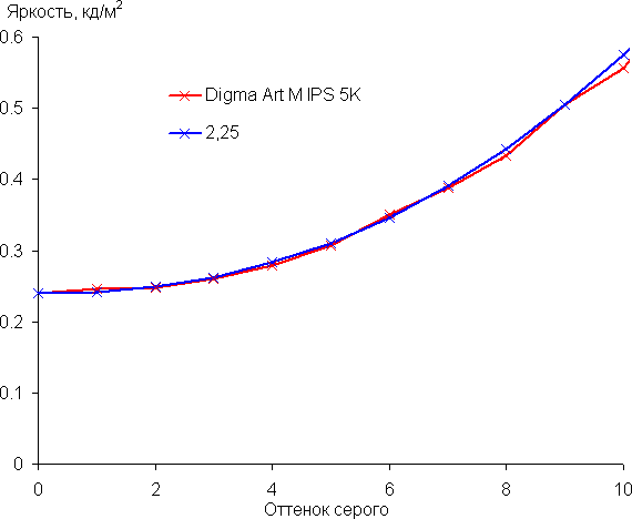 Аппроксимация полученной гамма-кривой дала показатель 2,25, что совсем немного выше стандартного значения 2,2, при этом реальная гамма-кривая мало отклоняется от аппроксимирующей степенной функции: