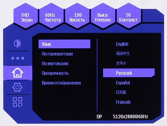 При необходимости можно установить уровень прозрачности фона меню, выбрать тайм-аут автоматического выхода из меню и переместить меню по горизонтали и по вертикали. Есть русская версия экранного меню.