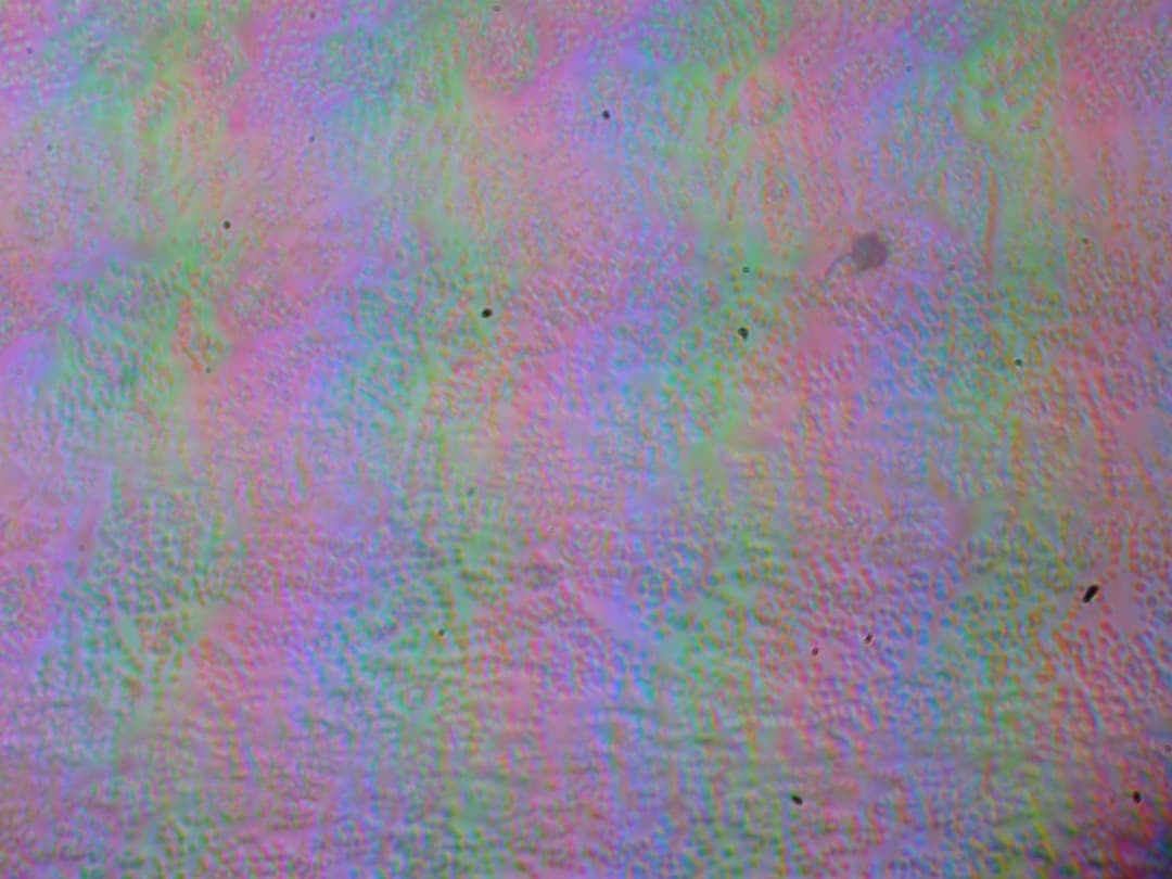 Зерно этих дефектов в несколько раз меньше размеров субпикселей (масштаб этих двух фотографий одинаковый), поэтому фокусировка на микродефектах и «перескок» фокуса по субпикселям при изменении угла зрения выражены слабо, из-за этого нет и «кристаллического» эффекта, но изменение яркости и цвета в пределах пикселей есть.