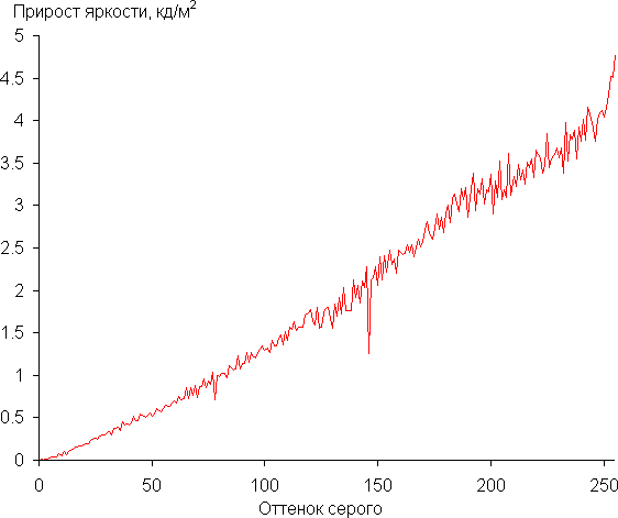 Для оценки характера роста яркости на шкале серого мы измерили яркость 256 оттенков серого (от 0, 0, 0 до 255, 255, 255). График ниже показывает прирост (не абсолютное значение!) яркости между соседними полутонами: