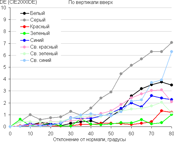 Для количественной характеристики изменения цветопередачи мы провели колориметрические измерения для белого, серого (127, 127, 127), красного, зеленого и синего, а также светло-красного, светло-зеленого и светло-синего полей во весь экран с использованием установки, подобной той, что применялась в предыдущем тесте. Измерения проводились в диапазоне углов от 0° (датчик направлен перпендикулярно к экрану) до 80° с шагом в 5°. Полученные значения интенсивностей были пересчитаны в ΔE относительно замера каждого поля при перпендикулярном положении датчика относительно экрана. Результаты представлены ниже: