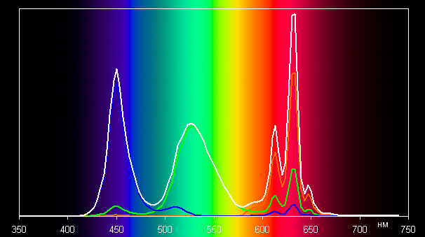 Ниже приведен спектр для белого поля (белая линия), наложенный на спектры красного, зеленого и синего полей (линии соответствующих цветов) в случае исходного цветового охвата:
