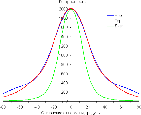 По скорости снижения яркости углы обзора неширокие, что для матрицы типа IPS нехарактерно. При отклонении в диагональном направлении яркость черного поля начинает резко возрастать уже при 20°-30° отклонения от перпендикуляра к экрану. Если сидеть не очень далеко от экрана, то черное поле по углам будет заметно светлее, чем в центре (приобретая слегка красноватый оттенок). Контрастность в диапазоне углов ±82° только в случае отклонения по диагонали приближается к отметке 10:1, но не опускается ниже.