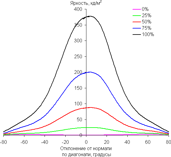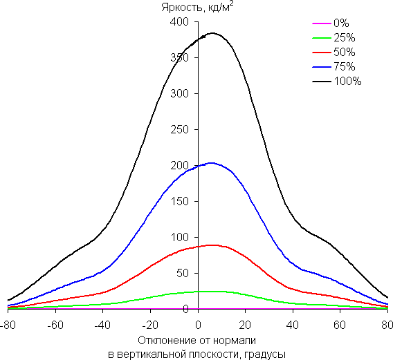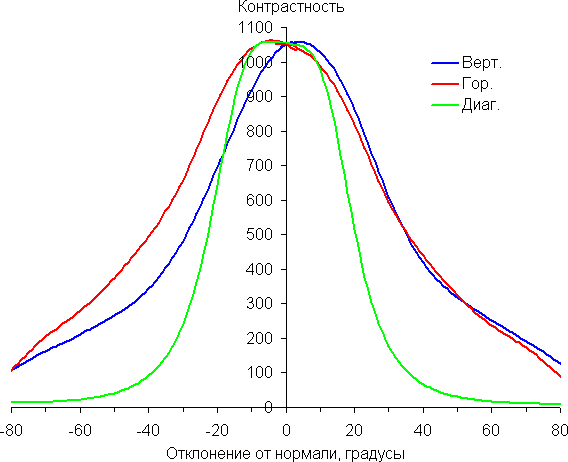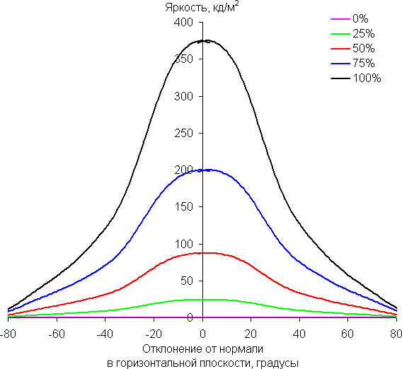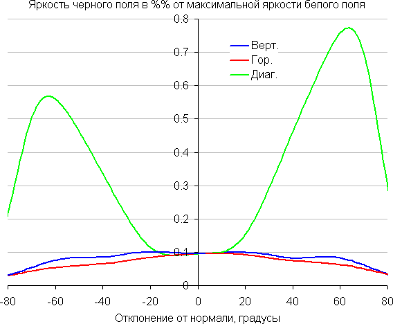 По скорости снижения яркости углы обзора неширокие, что для матрицы типа IPS нехарактерно. При отклонении в диагональном направлении яркость черного поля начинает резко возрастать уже при 20°-30° отклонения от перпендикуляра к экрану. Если сидеть не очень далеко от экрана, то черное поле по углам будет заметно светлее, чем в центре (оставаясь условно нейтрально-серым). Контрастность в диапазоне углов ±82° только в случае отклонения по диагонали приближается к отметке 10:1 и опускается ниже при 76°.