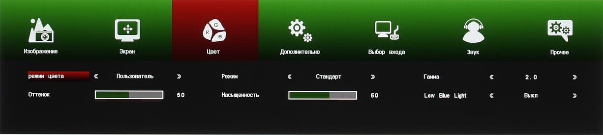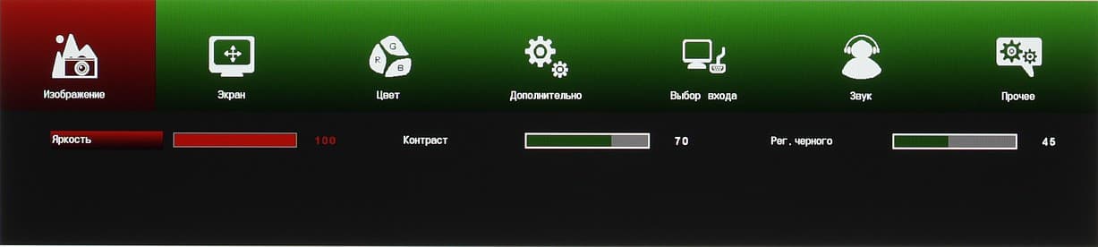 Настроек изображения совсем немного. Присутствуют стандартные настройки Яркость (регулирует яркость подсветки), Контраст, а также подстройка уровня черного. Отметим, что при изменении ряда настроек уровень черного может меняться, поэтому последняя из перечисленных настроек может пригодится, чтобы достичь максимальной контрастности без завала в тенях. Есть предустановленные профили с предустановленными значениями максимальной яркости или профилями гамма-кривой (список Режим).