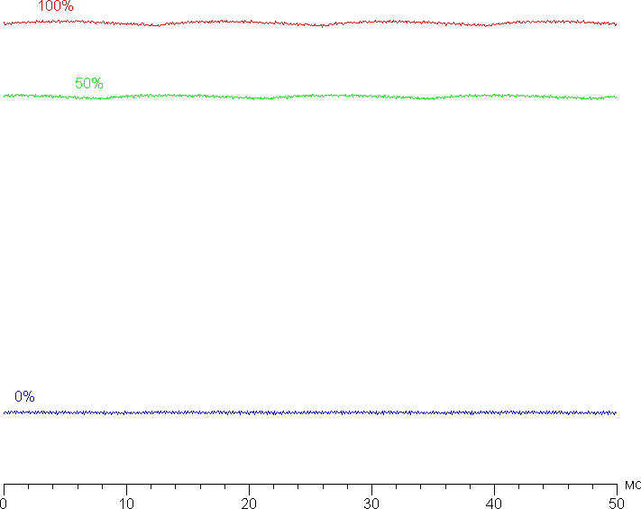 На любом уровне яркости значимая модуляция подсветки отсутствует, что исключает видимое мерцание экрана. Для тех, кто привык распознавать знакомое сокращение, уточним: ШИМ отсутствует. В доказательство приведем графики зависимости яркости (вертикальная ось) от времени (горизонтальная ось) при различных значениях настройки яркости: