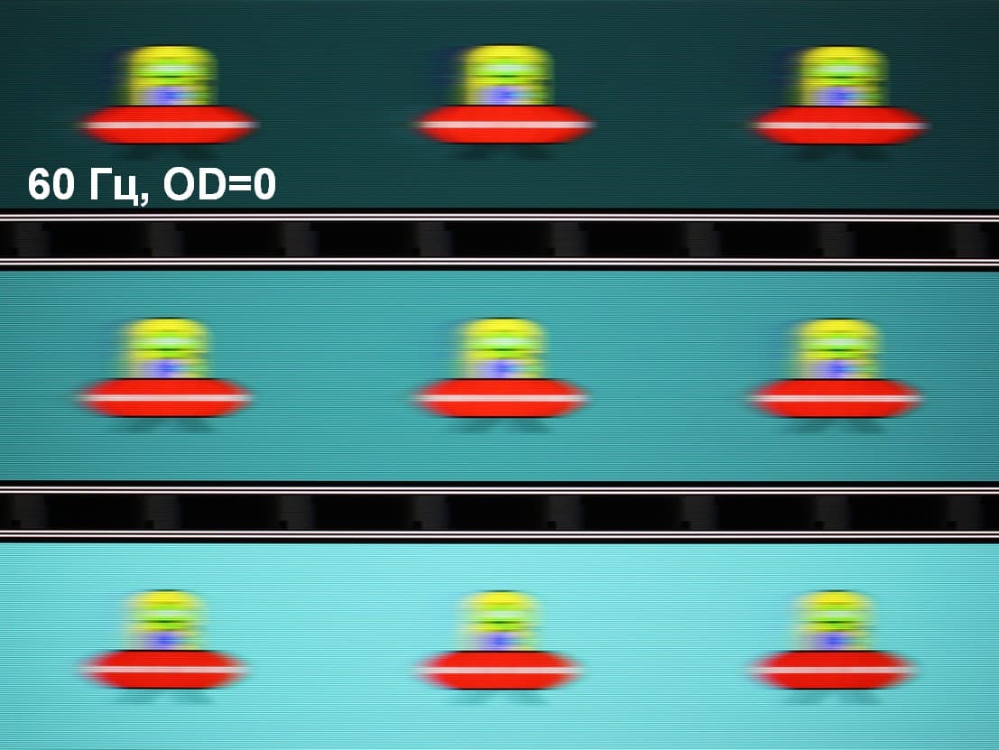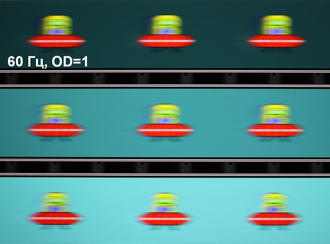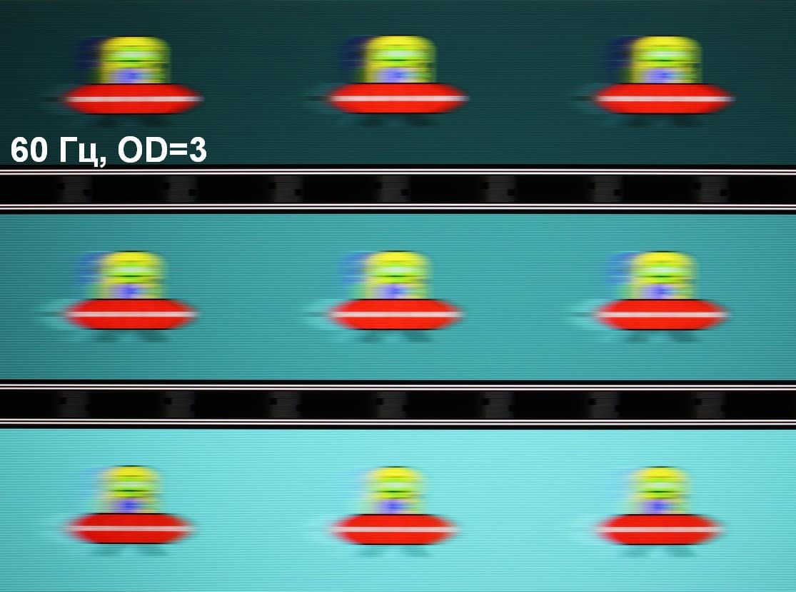 Видно, что при прочих равных условиях четкость изображения повышается по мере роста частоты обновления (в данном при случае 60 Гц даже на минимальном разгоне есть артефакты) и степени разгона, но на максимальном разгоне артефакты (шлейф позади тарелки) уже очень заметные.