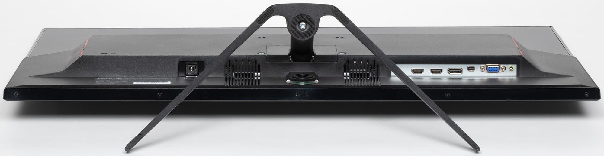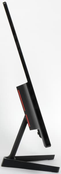 V-образное основание подставки с тонкими лучами ножек занимает мало рабочей площади стола. Также на лучи сверху можно поместить край клавиатуры. В верхней части монитор очень тонкий (порядка 10 мм), смотрится это стильно. Штатная подставка позволяет немного наклонить блок экрана вперед и отклонить назад на больший угол.