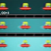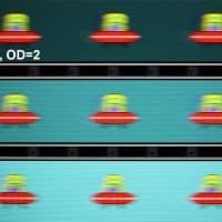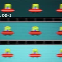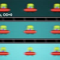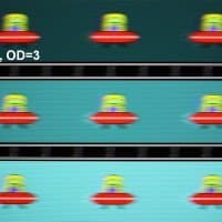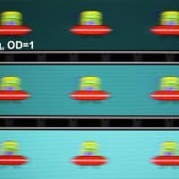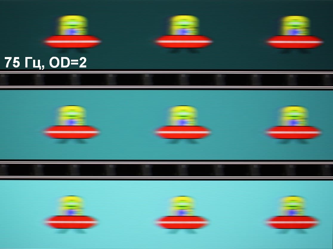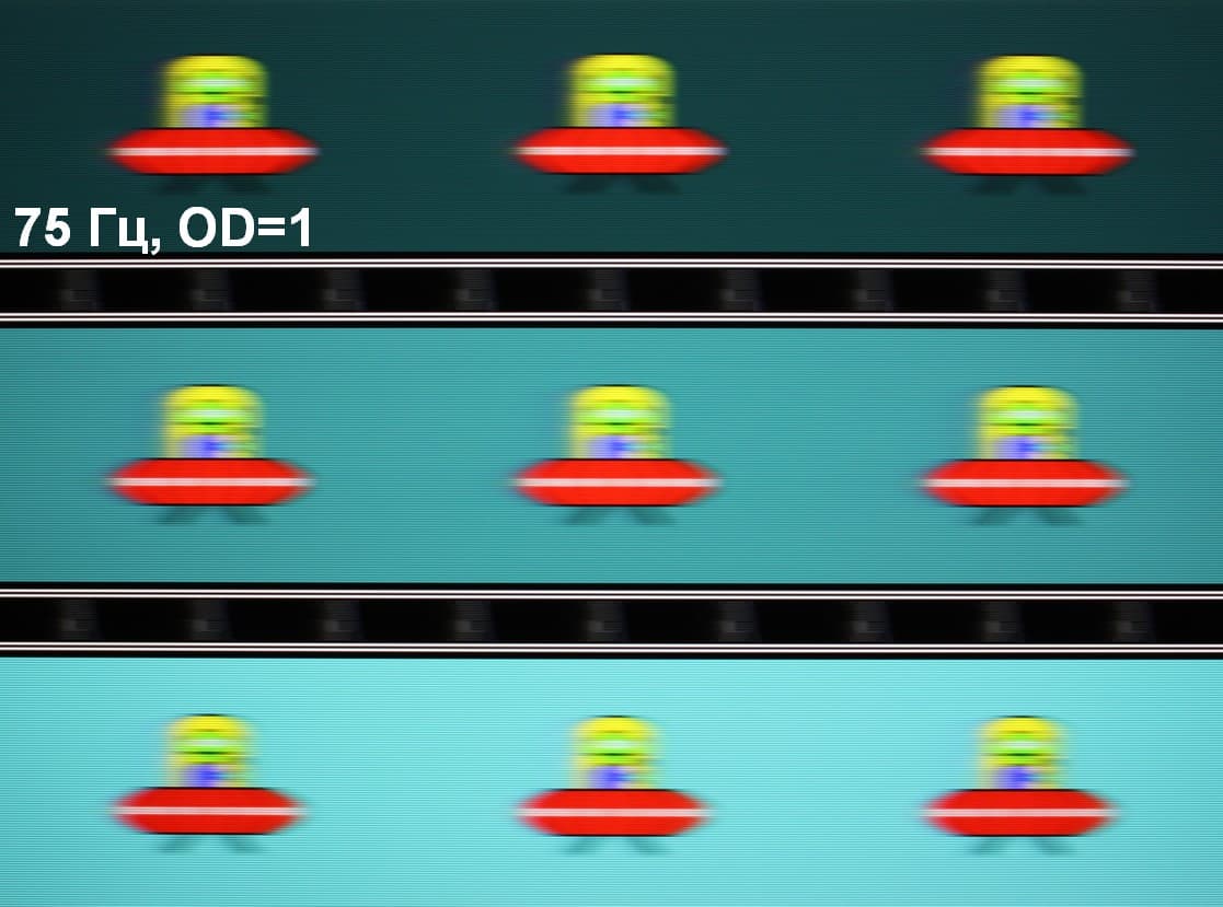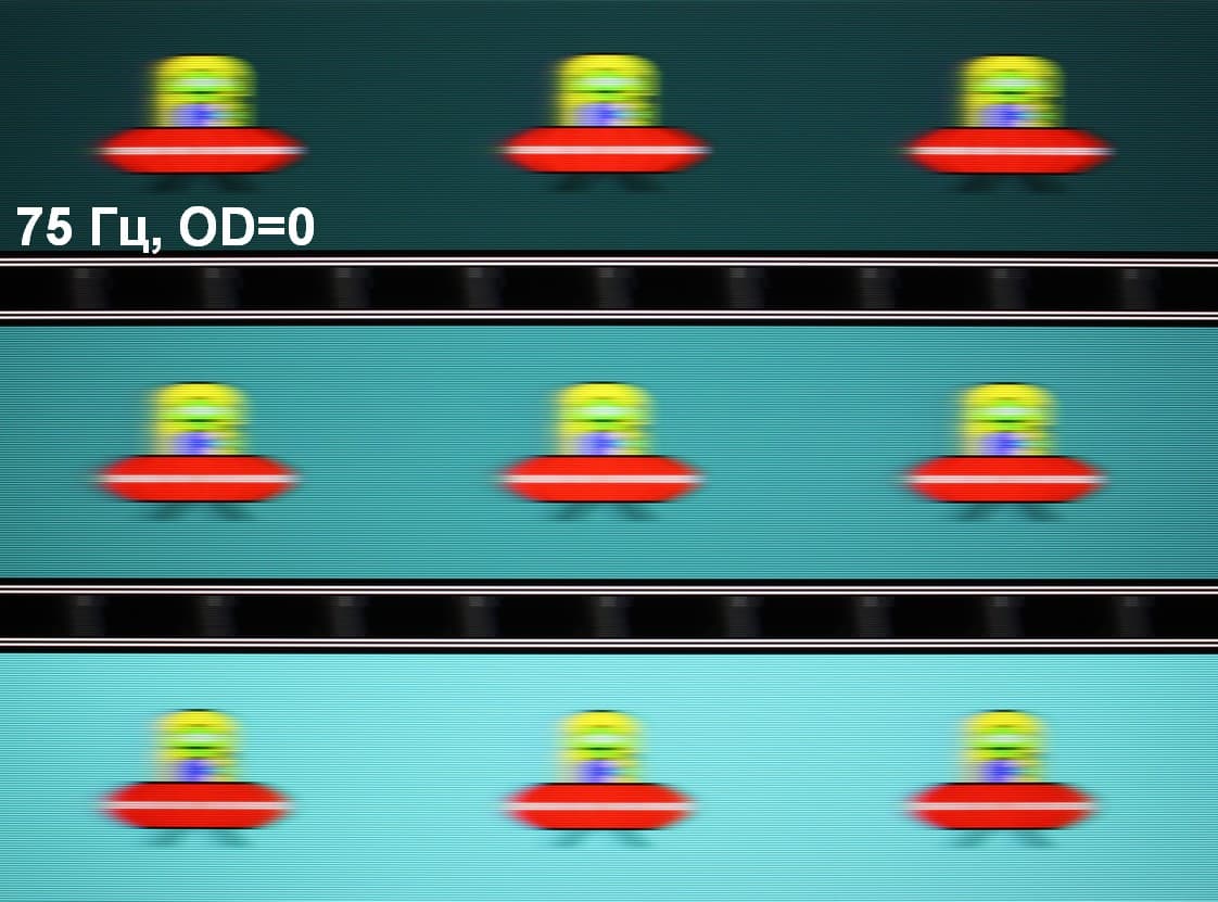 Для наглядного представления о том, что на практике означает такая скорость матрицы и какие могут быть артефакты от разгона, приведем серию снимков, полученных с помощью движущейся камеры. Такие снимки показывают, что видит человек, если он следит глазами за двигающимся на экране объектом. Описание теста приведено тут, страница с самим тестом тут. Использовались рекомендованные установки — скорость движения 960 пиксель/с для частоты 60 Гц, и 975 пиксель/с для 75 Гц. Выдержка 1/15 с, на фотографиях указаны значения частоты обновления, а также ступень разгона (OD с цифрой).
