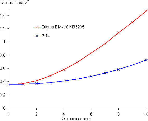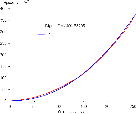 Аппроксимация полученной гамма-кривой дала показатель 2,14, что немного ниже стандартного значения 2,2. При этом реальная гамма-кривая слегка отклоняется от аппроксимирующей степенной функции: