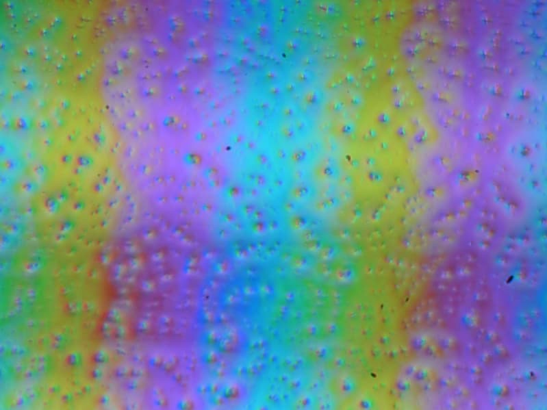 Зерно этих дефектов в несколько раз меньше размеров субпикселей (масштаб этих двух фотографий одинаковый), поэтому фокусировка на микродефектах и «перескок» фокуса по субпикселям при изменении угла зрения выражены слабо, из-за этого нет и «кристаллического» эффекта.