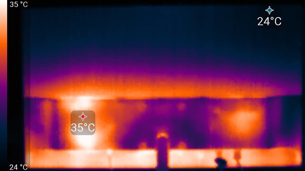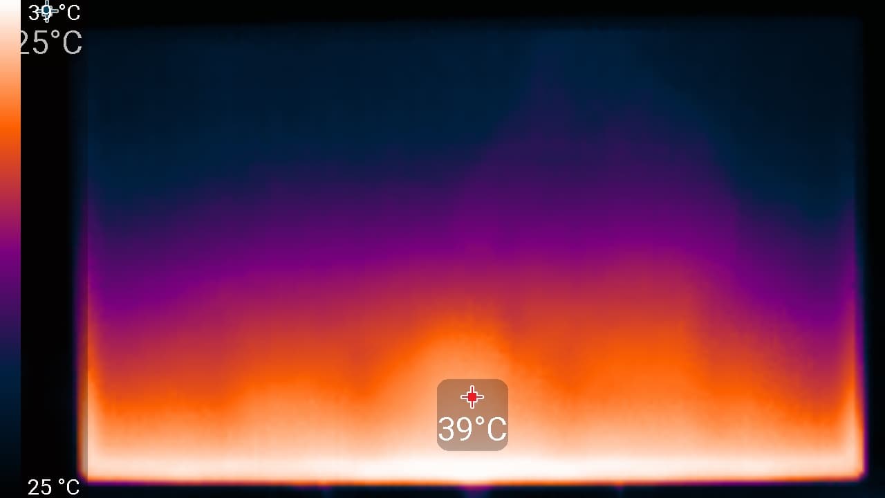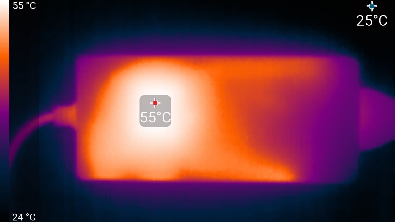 Нагрев умеренный. Повышенный нагрев нижнего края экрана показывает, что внизу находится светодиодная линейка подсветки экрана. Корпус БП нагрелся до 55 °C, что довольно много, поэтому лучше его ничем не накрывать:
