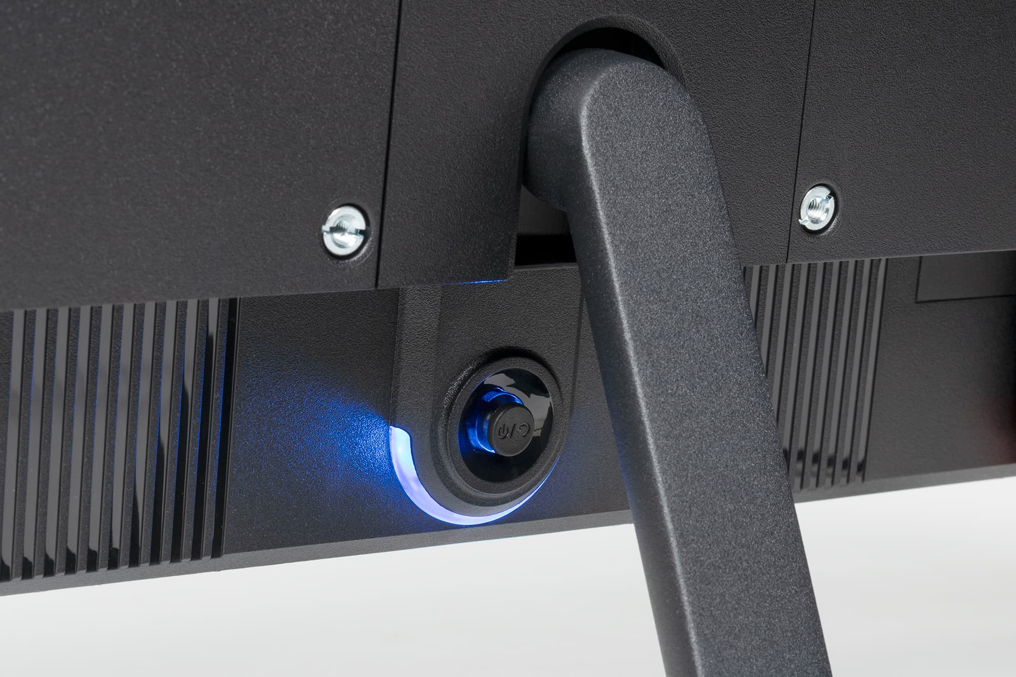 Индикатор питания при работе светится синим, в режиме ожидания — мигает красным, и не горит, если монитор условно (механического выключателя питания, к сожалению, нет) выключен. Когда на экране нет меню, то при долгом нажатии на джойстик монитор выключается (для включения достаточно короткого нажатия), при отклонении вправо — выводится ползунок регулировки громкости, влево — ползунок регулировки яркости, вверх — меню выбора входа, вниз — выводится главное меню с настройками. Меню достаточно крупное, надписи читаемые (для масштаба: белое поле — это вся область отображения).