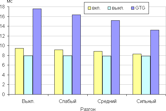 Время отклика зависит от значения настройки Разгон, которая управляет разгоном матрицы. Ступеней регулировки четыре. Диаграмма ниже показывает, как меняется время включения и выключения при переходе черный-белый-черный (столбики «вкл.» и «выкл.»), а также среднее суммарное время для переходов между полутонами (столбики GTG):