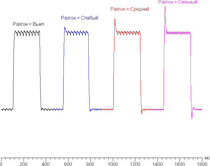 Ниже приведены графики полутонового перехода между оттенками 30% и 50% и обратно при различных значениях настройки Разгон (по вертикали — яркость, по горизонтали — время, для наглядности графики выстроены последовательно):