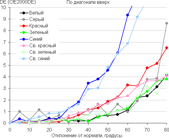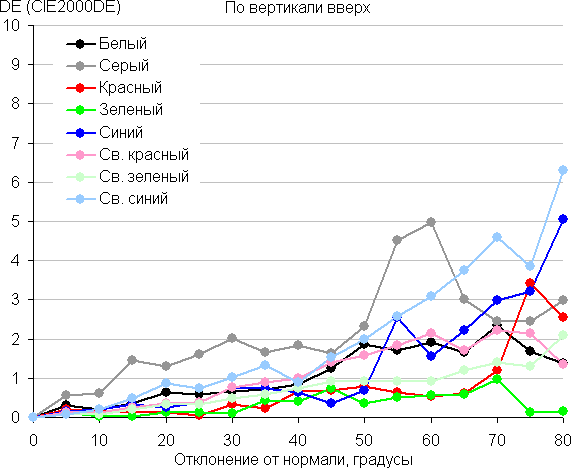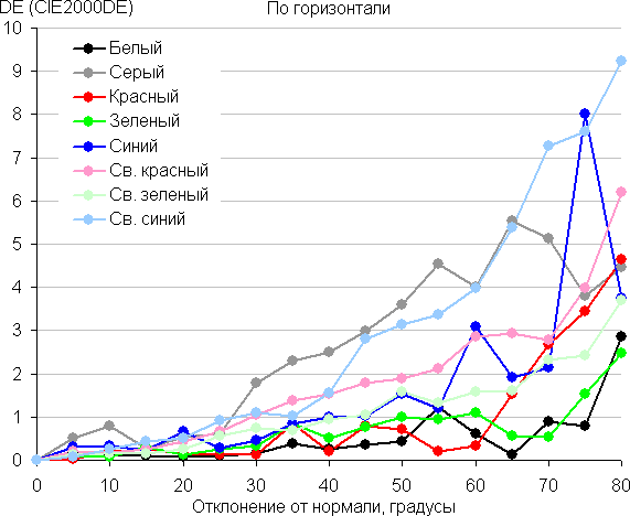 Для количественной характеристики изменения цветопередачи мы провели колориметрические измерения для белого, серого (127, 127, 127), красного, зеленого и синего, а также светло-красного, светло-зеленого и светло-синего полей во весь экран с использованием установки, подобной той, что применялась в предыдущем тесте. Измерения проводились в диапазоне углов от 0° (датчик направлен перпендикулярно к экрану) до 80° с шагом в 5°. Полученные значения интенсивностей были пересчитаны в ΔE относительно замера каждого поля при перпендикулярном положении датчика относительно экрана. Результаты представлены ниже: