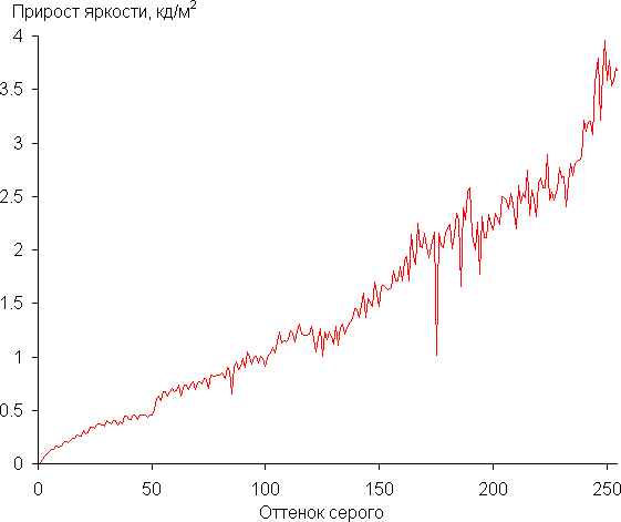 Реальная гамма-кривая ближе всего к стандартной при Gamma = 2.0, поэтому далее мы измерили яркость 256 оттенков серого (от 0, 0, 0 до 255, 255, 255) при этом значении. График ниже показывает прирост (не абсолютное значение!) яркости между соседними полутонами: