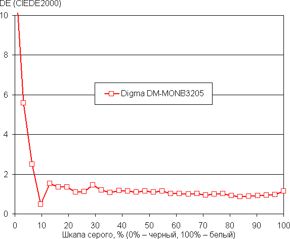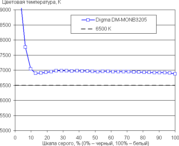 Цветовой баланс при выборе профиля Пользователь и при значении 41 для интенсивностей красного, зеленого и синего цветов (при этом достигаются максимальные значения яркости и контрастности) хороший, так как цветовая температура достаточно близка к стандартным 6500 К, и отклонение от спектра абсолютно черного тела (параметр ΔE) меньше 2 единиц, что даже для профессионального устройства считается великолепным показателем. При этом оба параметра мало изменяются на различных участках шкалы серого, что улучшает визуальное восприятие цветового баланса. Графики ниже показывают цветовую температуру на различных участках шкалы серого и ΔE: