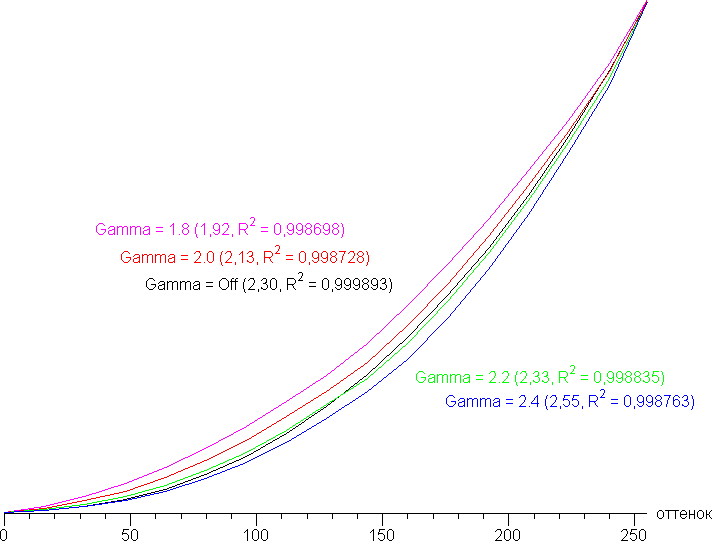 Реальная гамма-кривая зависит от выбранного профиля в списке Гамма (или Gamma). Значения показателя аппроксимирующей функции приведены в скобках в подписях, там же — коэффициент детерминации R²: