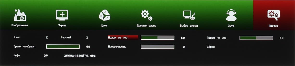 Навигация по меню удобная, хоть по началу и непривычная, списки зациклены, еще больше удобство повышается за счет джойстика, так как все делается только с его помощью и с него не нужно убирать палец. При настройке изображения меню остается на экране, что немного мешает оценке вносимых корректировок. Можно поменять положение меню на экране, настроить уровень прозрачности фона и выбрать тайм-аут автоматического выхода из меню.