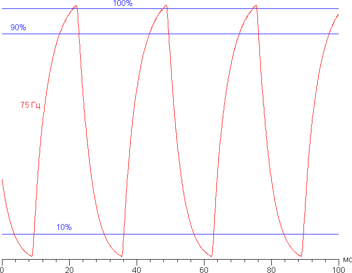 Приведем зависимость яркости (вертикальная ось) от времени (горизонтальная ось) при чередовании белого и черного кадра при 75 Гц кадровой частоты (разгон максимальный):