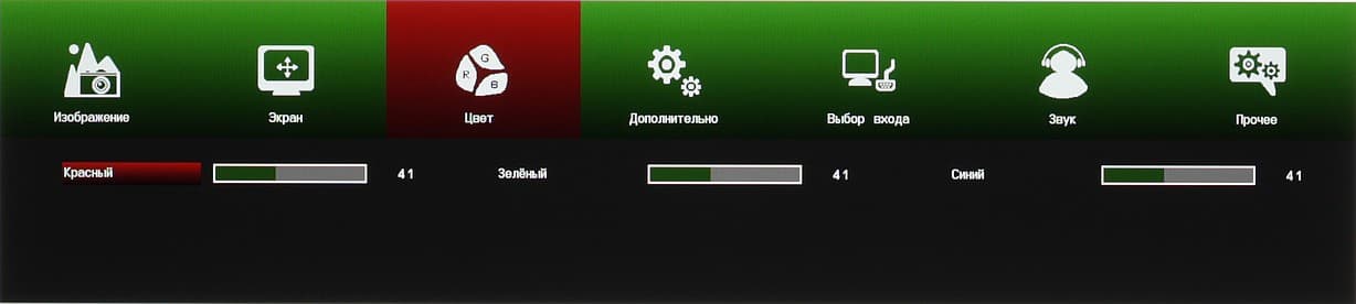 Цветовой баланс устанавливается выбором одного из четырех предустановленных профилей или ручной регулировкой интенсивности трех цветов после выбора профиля Пользователь.