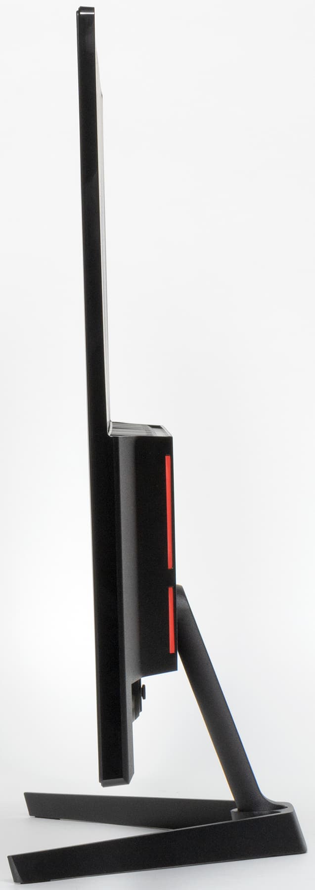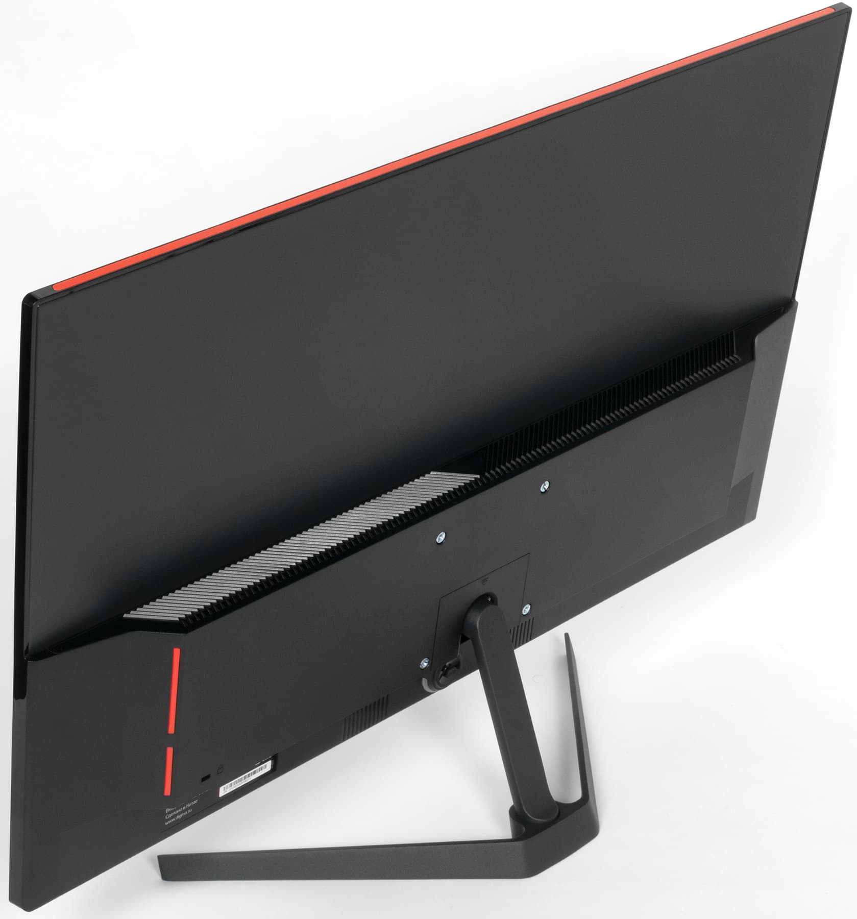 Фронтальная рамка экрана изготовлена из стали и имеет черное матовое покрытие. Рамка выступает от плоскости матрицы всего на 1 мм и она неширокая, поэтому монитор выглядит современно и стильно. Обрамление блока экрана выполнено в виде единой с кожухом задней панели пластиковой детали. Торцы блока экрана глянцевые, тогда как кожух сзади имеет матовую шершавую поверхность. На верхнем торце и на кожухе есть красные вставки из пластика. Смотрится это оригинально.
