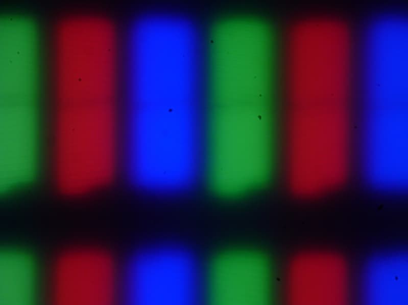 Из-за матовой поверхности экрана четкого изображения пикселей получить не удалось (черные точки — это пыль на матрице фотоаппарата), однако характерная для IPS структура субпикселей просматривается: