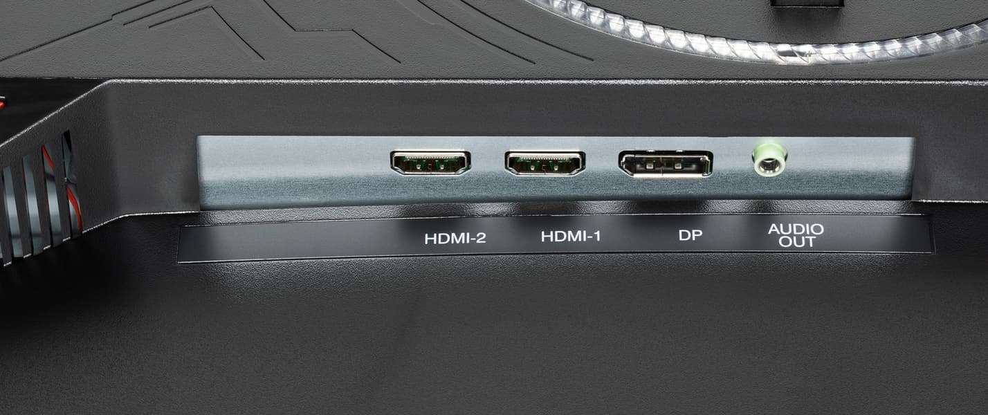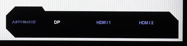 Видеовходов три — пара HDMI версии 1.4 и DisplayPort. Из них только вход DisplayPort поддерживает на вход сигнал с максимальными для этого монитора разрешением и частотой кадров. Входы выбираются в меню, кроме того, в случае отсутствия сигнала на текущем входе срабатывает автоматический выбор активного входа (эту функцию можно отключить). Эти входы способны принимать цифровые аудиосигналы (только PCM стерео), которые выводятся после преобразования в аналоговый вид на встроенные громкоговорители и через гнездо миниджек 3,5 мм. К этому гнезду можно подключить внешнюю активную акустическую систему или наушники.