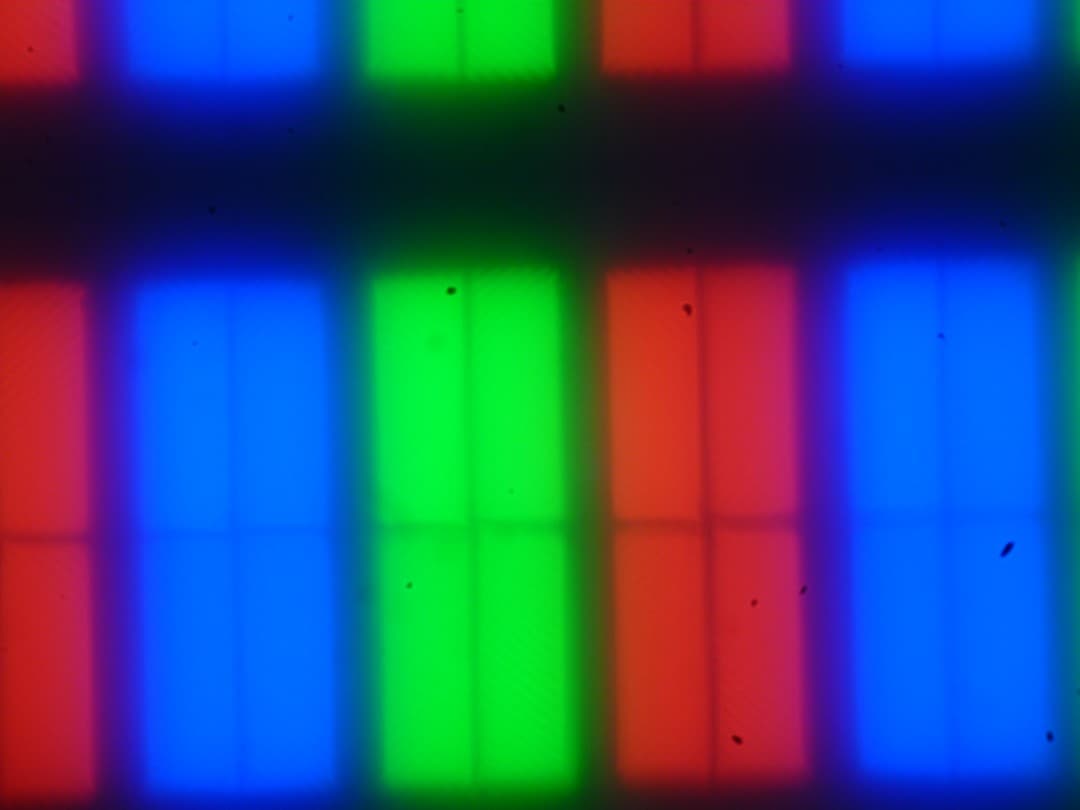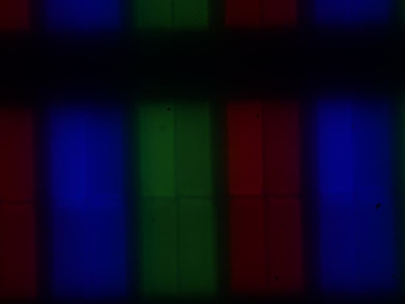 Четкое изображение структуры пикселей из-за матовой поверхности получить не удается, впрочем, на фрагменте ниже можно разглядеть типичную для VA структуру в виде параллельных полосок, а также что каждый субпиксель делится на четыре равных домена, в которых полоски ориентированы под разными углами (черные точки — это пыль на матрице фотоаппарата):