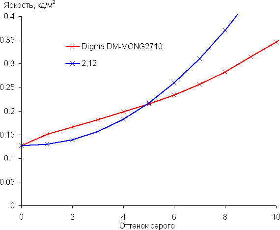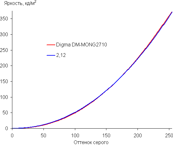 Аппроксимация полученной гамма-кривой дала показатель 2,12, что немного ниже стандартного значению 2,2, поэтому картинка чуть высветлена, но для игрового монитора это совсем не критично. При этом аппроксимирующая степенная функция мало отклоняется от реальной гамма-кривой: